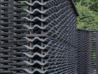 我們都知道,水泥瓦一般用作普通民房或者高檔別墅的屋頂建設(shè),但是設(shè)計(jì)師弗里達(dá)、埃斯科韋多設(shè)計(jì)的蛇形展亭,以水泥瓦建造,這種水泥瓦一般用于建造屋頂,顏色偏深而且具有獨(dú)特的質(zhì)感。展亭將水泥瓦以左右錯(cuò)位、類似植物的排列方式堆疊,形成帶有墨西哥特色的鏤空墻幕。展亭的庭院中還設(shè)一個(gè)三角形的水池,屋頂?shù)紫聞t以鏡面鋪就,在日光照射